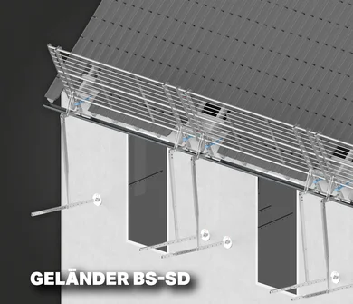 Das Geländer BS-SD wird einfach in die Regenrinne eingehängt und über Stützen an der Gebäudewand abgestützt, ganz ohne feste Montage oder Bohrungen. Es ist auflastgehalten, verursacht keine Schäden oder Spuren und kann nach Abschluss der Arbeiten schnell wieder entfernt werden. Dadurch bleibt die Dachhaut und Fassade vollständig unversehrt.